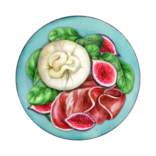 (pelat, mozzarella, italijanska pršut, burrata, rukola, čeri)